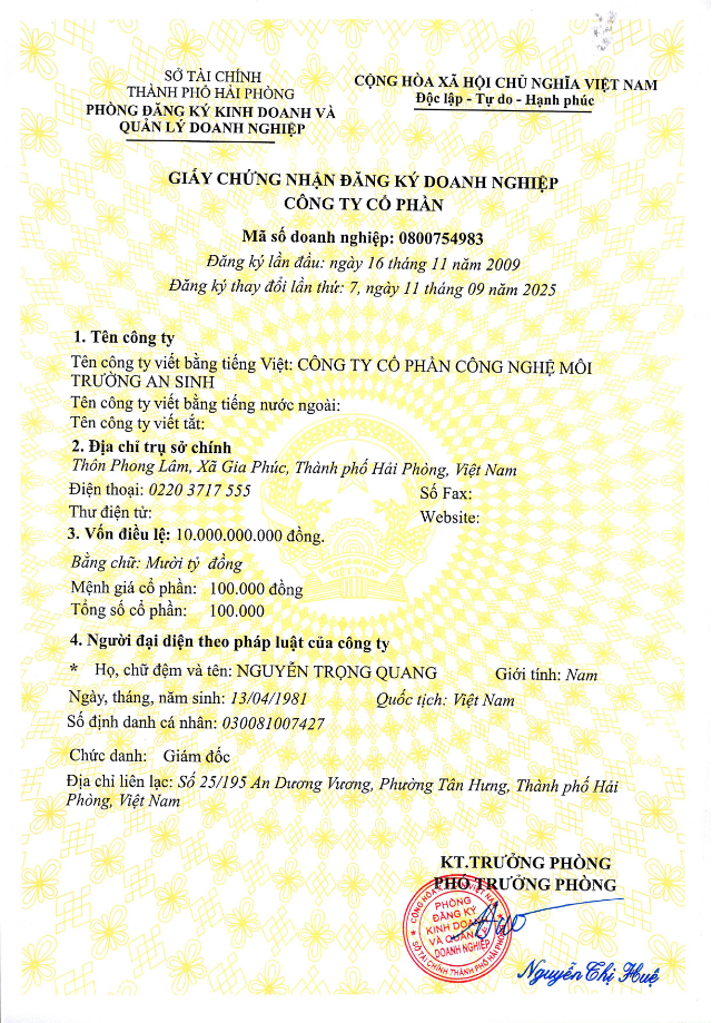 Công ty cổ phần công nghệ môi trường An Sinh được thành lập theo giấy chứng nhận đăng ký kinh doanh số: 0800754983 do Sở đầu tư tỉnh Hải Dương cấp đăng ký lần đầu ngày 16 tháng 11 năm 2009, cấp đăng ký thay đổi lần thứ 4 ngày 27 tháng 2 năm 2014. Công ty hoạt động theo mô hình Công ty cổ phần, Hội đồng quản trị đại diện cho chủ sở hữu, giám đốc chịu trách nhiệm điều hành mọi hoạt động sản suất kinh doanh của công ty. Công ty cổ phần công nghệ môi trường An Sinh luôn nỗ lực xây dựng cho mình một chiến lược phát triển sản xuất kinh doanh trong lĩnh vực công nghệ môi trường.